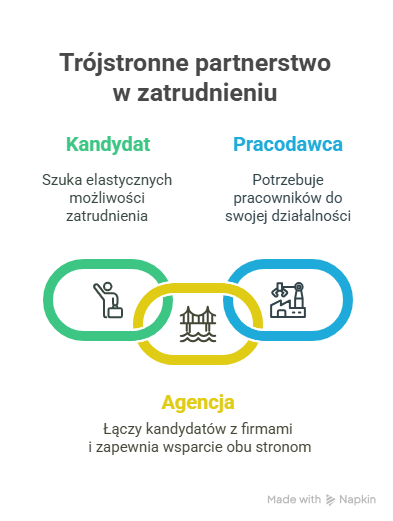 W tym układzie agencja jest Twoim pracodawcą – to ona zawiera z Tobą umowę, wypłaca wynagrodzenie i odpowiada za wszystkie formalności związane z zatrudnieniem. Natomiast samą pracę wykonujesz w miejscu wskazanym przez pracodawcę użytkownika, pod jego kierownictwem.